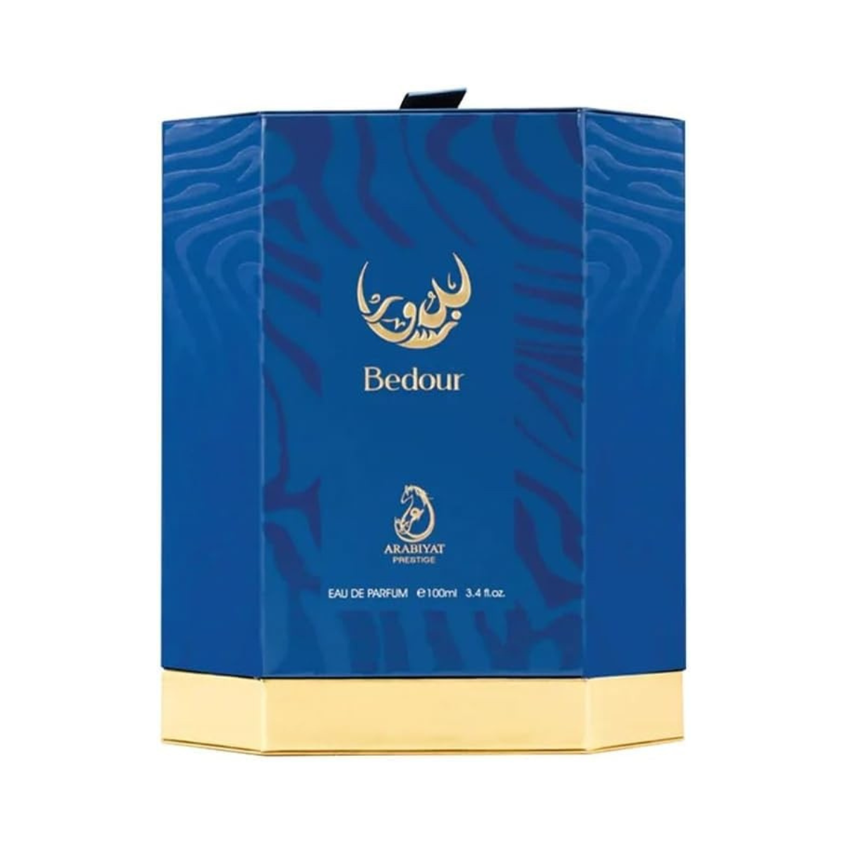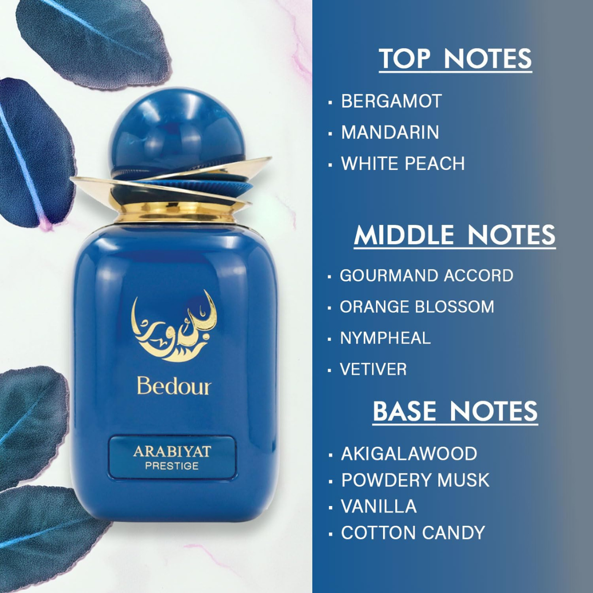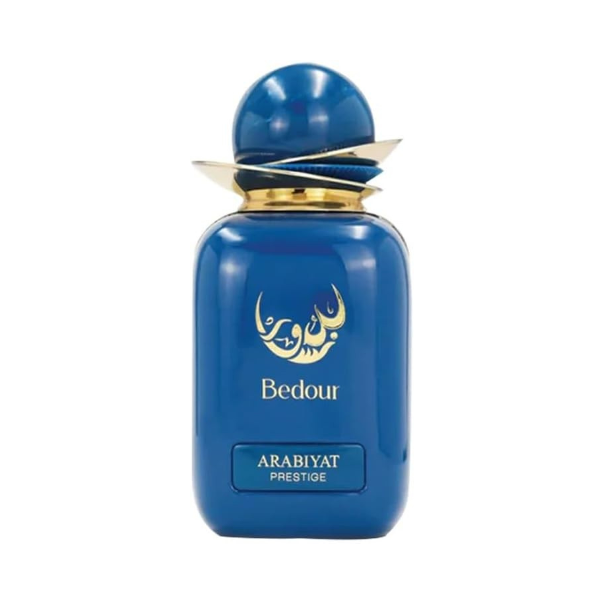 - Arabiyat Prestige Bedour Eau De Parfum is a mesmerising sensory experience drawing a parallel between a woman and the celestial beauty of the moon. A dreamy and romantic voyage with a delectable gourmand touch, it is a perfume of unforgettable impressions. The fragrance opens on a delicate blend of fresh bergamot, red fruits, and juicy pear, creating a succulent invigorating top note. The floral heart of elegant rose and sensual jasmine is soothed by the luscious trail of warm vanilla and creamy sandalwood. The bottle complements the exuberance of the juice.